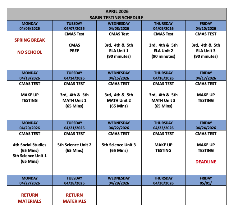 The Colorado Measures of Academic Success (CMAS) are end-of-year tests that help students and parents understand if students are on track to meet the expectations of college and careers. Score reports show how students are doing compared to the school, district and state. The testing window is April 6-24, opening the day our students return from Spring Break.